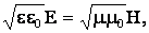Взаимно перпендикулярные векторы Е и Н колеблются в одной фазе (их колебания синфазные). Модули этих векторов связаны соотношением: