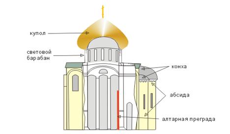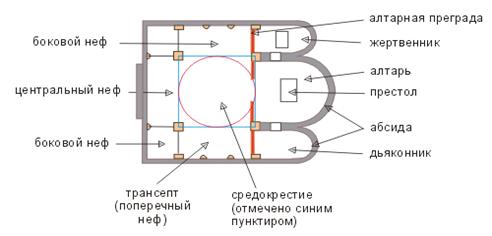 В классическом крестово-купольном храме квадратное в плане здание делилось рядами столбов или колонн на нефы - межрядовые пространства, идущие от входа к алтарю. Нефов, как правило, было 3, 5 или 7, причем ширина центрального нефа вдвое превышала ширину боковых. Точно по центру здания в центральном нефе симметрично располагались четыре главных столба, несущих купол. Эти столбы выделяли в пространстве храма еще один неф - поперечный или трансепт. Квадратное подкупольное пространство между главными столбами, являющееся пересечением центрального нефа и трансепта, называется средокрестием. Со столбов на стены перекидывались арки, несущие полуцилиндрические (бочковые) своды. На четыре главных столба опирался барабан со световыми окнами, поддерживающий главный купол храма. С центральным куполом могли соседствовать от 4 до 12 меньших куполов (главный купол символизирует Христа, 5 куполов - Христа с евангелистами, 13 куполов - Христа с апостолами).