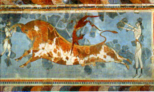 Фреска с таврокатапсией показывает, насколько динамичным и живым было минойское искусство. Ему были чужды застывшие позы, остановившиеся взгляды, самоуглублённость – всё, что было так дорого египтянам и обитателям древнего Двуречья (Месопотамии). Для критян был важен момент, верно схваченное действо, трепет настоящего. Вот юноша делает сальто над спиной быка, вот бык уже пронзил рогами одну противницу . Пусть громадный – он массивнее всех борцов, вместе взятых, – бык тем не менее обречён. Он летит в пространстве, отрываясь от земли, но борцы проворнее, ловчее: они успевают одолеть бога-быка до того, как им нанесены смертельные раны.