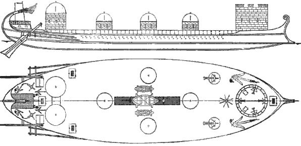 Рисунок 13 Децемрема (ок. 41 г. до н.э.). Представляет собой 2-3 ярусный боевой корабль, на каждом весле по 3-4 гребца. (вооружение – до 12 метательных машин)