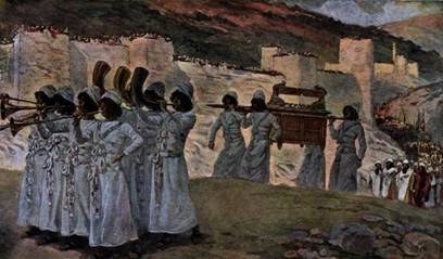 вокруг города все, способные к войне, и обходите город однажды в день; и это делай шесть дней. И семь священников пусть несут семь труб юбилейных пред ковчегом; а в седьмой день обойдите вокруг города семь раз, и священники пусть трубят трубами. Когда затрубит юбилейный рог, когда услышите звук трубы, тогда весь народ пусть воскликнет громким голосом; и стена города обрушится до своего основания, и весь народ войдет в город .