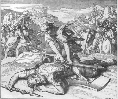 Давид положил пять гладких камней в свою пастушескую сумку, взял пращу, то есть палку, приспособленную для бросания камней, и пошел против Голиафа. Голиаф с презрением взглянул на Давида, потому что он был очень молод, и с насмешкой сказал: "разве я собака, что ты с камнями и палкою идешь на меня?". Давид ответил: "ты идешь против меня с мечем, копьем и щитом, а я иду против тебя во имя Господа Саваофа, Бога воинств израильских, которые ты поносил. Господь поможет мне, и вся земля узнает, что не мечем и копьем спасает Господь". И вот, когда Голиаф стал приближаться, Давид поспешил к нему навстречу, вложил камень в пращу и пустил его в великана. Камень попал ему прямо в лоб. Голиаф упал без чувств на землю. Давид подбежал к Голиафу, вытащил у него меч и его же собственным оружием отсек ему голову. Увидев это, филистимляне, объятые ужасом, бросились в бегство, а израильтяне гнали их до самых городов их и многих убили.