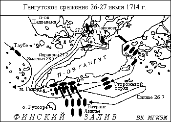 эффективную поддержку русских войск в Финляндии. В Гангутском сражении русское командование смело использовало преимущество гребного флота в борьбе с линейным парусным флотом шведов в условиях шхерного района, умело организовало взаимодействие сил флота и сухопутных войск, гибко реагировало на изменения тактической обстановки и погодных условий, сумело разгадать маневр противника и навязать ему свою тактику. Высокие морально-боевые качества солдат, матросов и офицеров позволили русскому флоту нанести поражение численно превосходящему шведскому флоту.
