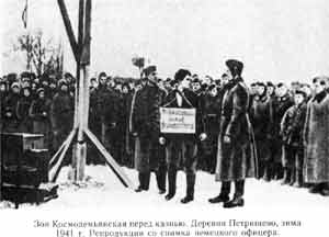 вмешательством ты бросаешь легкую тень недоверия и подозрения. Пытаясь осмыслить чужие подвиги, ты невольно ставишь себя на место героя и задаешься одним вопросом - а ты смог бы повторить такое? Еще труднее анализировать чужой поступок, если вообще неизвестно - а был ли он. Нет ни главного героя, ни самого поступка, вся биография большой миф. Зоя Космодемьянская была первой женщиной, которой присвоили звание Героя Советского союза во время Великой Отечественной войны. И не просто присвоили, а создали самую большую легенду за всю историю войны. Кто не знает Зою Космодемьянскую. Знают все … и, как не странно, не знает чникто. Что же знают все: Космодемьянская Зоя Анатольевна, родилась 13 сентября 1923 года в селе село Осиновые Гаи Тамбовской области, погибла 29 ноября 1941 года в деревне Петрищево Верейского района Московской области. Звание Героя Советского Союза присвоено 16 февраля 1942 г., посмертно. В 1938 году вступила в ВЛКСМ. Ученица 201-й московской средней школы. В октябре 1941 добровольно вступила в истребительный партизанский отряд. У деревне Обухово Наро-Фоминского района перешла с группой комсомольцев-партизан линию фронта. В конце ноября 1941 года Космодемьянская поймана при выполнении боевого задания и после пыток казнена немцами. Стала первой женщиной - Героем Советского Союза и героиней массированной пропагандистской кампании. Утверждалось, что перед смертью Космодемьянская произнесла речь, закончившуюся словами: "Да здравствует товарищ Сталин". Ее именем названы многие улицы, колхозы, пионерские организации. Эти данные у всех отложились еще со школьной скамьи, но они никак не могут ответить на вопросы, которые не раз возникали у некоторых: - Как было доказано, что девушка схваченная в Петрищево и есть Зоя Космодемьянская - Куда делась диверсионная группа, в состав которой входила Таня-Зоя - Как именно была поймана Таня-Зоя - Были ли немцы в Петрищево в момент неудачного поджога - Где была повешена Таня-Зоя. Ноябрь 1941 года. Немцы в 30 километрах от Москвы. Наспех собранные дивизии народного ополчения грудью встали на защиту Москвы и преградили путь обескровленным дивизиям врага. Машины блицкрига буксовали в сотнях тысяч трупов ополченцев. Все кто мог держать оружие - направляли в окопы, а кто не мог - за линию фронта применять тактику выжженной земли. Выжигалось все, что хоть как-то могло задержать немецкое наступление. Именно поэтому у комсомольцев-диверсантов не было не оружия, ни гранат и мин, а только бутылки бензина. Они были простым пушечным мясом, которое быстро сгорало в топке войны. Если командованию не жалко своих диверсантов, будет ли оно жалеть мирных жителей, чьи дома должны сгореть и не достаться немцам, пусть даже теоретически. Мирные жители оказались на временно занятой территории, а значит пособники оккупантов, поэтому нечего с ними разбираться. Мирные жители, в основном старики, женщины и дети были ни в чем не виноваты, это превратности войны. Пока через тоже самое Петрищево прошла линия фронта, большая часть деревни была разрушена и все оставшиеся в живых жители ютились в нескольких избах. Зиму 1941 года все помнят своей лютой стужей. В такой мороз остаться без дома - верная смерть. Члены диверсионной группы получили задание сжечь деревню. Если кто-то думает, что девушка-партизанка спокойно лежала на краю опушки леса