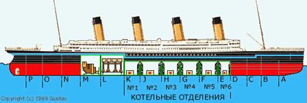 На "Титанике" имелось восемь стальных палуб, расположенных друг над другом на расстоянии 250-320 сантиметров. Самая верхняя - шлюпочная палуба, под ней семь палуб, обозначенных сверху вниз буквами от A до G, затем настил второго дна, а еще ниже на расстоянии около полутора метров от киля, второе дно. Только палубы C, D, E и F протягивались по всей длине судна.