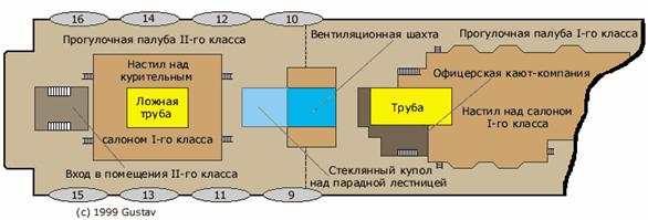 На открытой шлюпочной палубе размещались 20 спасательных шлюпок. В ее передней части находился ходовой мостик, удаленный от носа судна на 58 метров. На мостике располагалась ходовая рубка со штурвалом и компасом, сразу за ней помещение, где хранились навигационные карты. Справа от рулевой рубки были штурманская рубка, каюта капитана и часть кают офицеров, слева - остальные каюты офицеров. Позади них за передней трубой - рубка радиотелеграфа и каюта радиста.