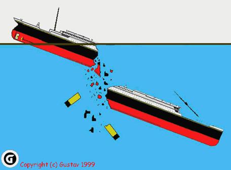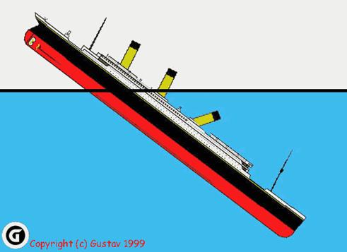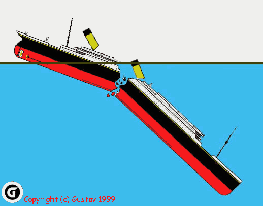 Носовая часть ушла под воду, обламывается вторая труба. Корма поднимается под углом 45 градусов, и киль испытывает огромные перегрузки.