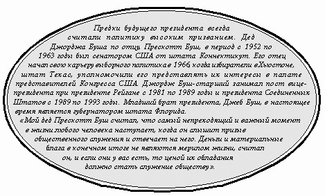 На государственной службе Джордж Буш-старший дослужился до должности директора ЦРУ, был видным деятелем Республиканской партии и в 1988 году стал 41-м президентом США.