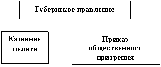В каждой губернии создавался обширный штат чиновников. При губернаторе существовало губернское правление, надзиравшее за деятельностью всех губернских учреждений и должностных лиц. Финансами и хозяйственными делами занималась Казенная палата. Школами и «богоугодными» заведениями (больницами, богадельнями и т. д.) ведал Приказ общественного призрения («призирать» - опекать, заботиться), в котором заседали выборные представители сословий под председательством правительственного чиновника. В уездах исполнительным органом власти был нижний земский суд во главе с капитан-исправником, избираемым местным дворянством. В уездных городах власть принадлежала назначаемому городничему.