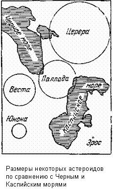 Все планеты, обнаруженные между орбитами Марса и Юпитера [1], получили общее название малых планет или астероидов, что в переводе с греческого означает «звездоподобные». Действительно, даже в самые сильные телескопы эти планеты выглядят как звездочки, так они малы. Малость в астрономии — понятие, конечно, относительное, но в сравнении с остальными планетами астероиды действительно малы. Самый большой — Церера имеет около 1000 км в поперечнике и по объему во столько раз меньше Луны, во сколько раз Луна меньше Земли. У Паллады диаметр около 600 км, у Юноны около 250 км и у Весты около 540 км [2]. Только у них, и то с помощью величайших в мире рефракторов, можно заметить крошечный диск. Их поперечники можно измерить, но никаких подробностей на них рассмотреть нельзя. Поперечники остальных астероидов гораздо меньше, их оценивают по блеску этих тел. При одной и той же отражательной способности поверхности и при одном и том же расстоянии от Земли и от Солнца видимый блеск планеты пропорционален квадрату ее диаметра. Предполагая, что поверхность астероидов отражает около 7 % падающего на нее света, подобно другим небесным телам, также лишенным атмосфер (как Луна), можно приблизительно оценить размер этих планет-крошек. Самые малые из известных теперь астероидов имеют поперечник порядка 1 км и вполне могли бы поместиться на территории наших парков