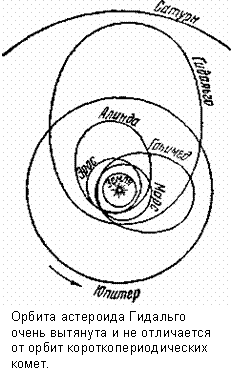Орбиты астероидов, носящихся преимущественно между орбитами Марса и Юпитера, часто отличаются от орбит больших планет сильными наклонами к эклиптике и большой вытянутостью (большим эксцентриситетом). У астероидов наклоны доходят до 43º (у Гидальго), а эксцентриситет — до 0, 65 (у него же). Особенно много таких сильно наклоненных и крайне вытянутых орбит открыто за последнее время преимущественно у мелких астероидов. В этом отношении орбиты астероидов представляют промежуточное звено между почти круговыми орбитами больших планет и очень вытянутыми орбитами комет. У Гидальго и у некоторых других астероидов орбита вытянута даже больше, чем у ряда комет.