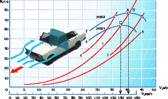 Так изменяется необходимая для движения мощность в зависимости от скорости автомобиля: N – мощность, л.с.; V – скорость, км/ч (м/с); Cx – коэффициент аэродинамического сопротивления; S – "лобовая площадь" автомобиля; 1 – расчетная мощность, с учетом изменения потерь на качение шин по скорости; 2, 6 – характеристики максимальной ("располагаемой") мощности двигателей ВАЗ-2103 и ВАЗ-2101; 3, 4 – результаты расчета для попутного и встречного ветра 5 м/с; 5 – расчетная кривая необходимой мощности для современного автомобиля со сниженным аэродинамическим сопротивлением Сх = 0,3.