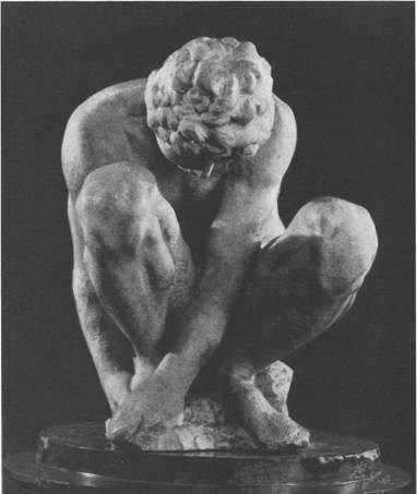Юноша, согнувшись и наклонив голову, касается руками правой ступни. Напрасно искать какую бы то ни было мотивировку этого движения. Жанровые, бытовые черты просто не существовали для Микеланджело. Человек начинался для пего там, где можно было поведать о его героических деяниях и свершениях. Недаром спина мальчика подчеркнуто мускулиста и мощна. Не лицо, а тело и поза раскрывают созданный мастером образ.