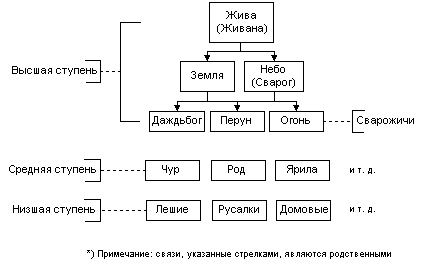 К среднему уровню могли относиться божества, связанные с хозяйственными циклами и сезонными обрядами, а также боги, воплощавшие целостность замкнутых небольших коллективов: Род, Чур у восточных славян и т.п. Возможно, что к этому уровню относилось и большинство женских божеств, обнаруживающих близкие связи с коллективом, иногда менее уподобленных человеку, чем боги высшего уровня.