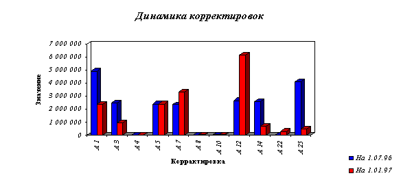 Таблица корректировок. Данные приведённой таблицы свидетельствуют о некотором улучшении положения банка: корректировка А1 (недонасозданный резерв на потери по ссудам) снизилась на 51,7 % за пол года, что говорит о начислении средств в данный резерв (данный факт свидетельствует о законопослушании банка), на 87,8 % по сравнению с 1.07.96 года сократились проценты, просроченные более 30 дней.