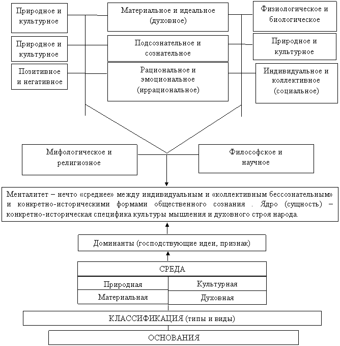Ментальность определяется как характеристика либо одной личности, либо определенного общества или сообщества в целом. Существенный вклад в разработку проблемы ментальности внес К.Г.Юнг. Предложенный им термин «архетип»( греческое слово архетип в переводе означает первообраз) по своему содержанию близок к менталитету. Динамика времени определяется и выражается господствующими в обществе архетипами; смена времен означает смену архетипов или, по крайней мере, способов их проявления и акцентуации. Как правило, ведущие архетипы эпохи завуалированы и опосредованы социальными ритуалами и общепринятыми полусознательными представлениями, с которыми никто не спорит и даже не ставит под сомнение - просто потому, что это не приходит в голову. Воздух, которым мы дышим, не является предметом обсуждения - до тех пор, пока он не меняет решительно своего химического состава, к которому нужно заново адаптироваться или, если это оказывается невозможным, качественно его менять. По этой причине не вдаваясь в их анализ, под менталитетом будем понимать определенную совокупность тех компонентов сознания, которые обусловливают его структурную целостность и качественную социальных (этнических) общностей.