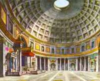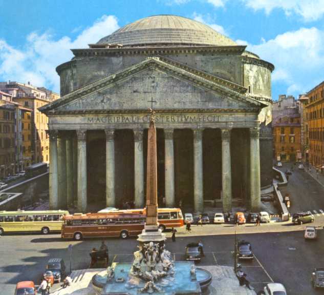 На фронтоне уцелела надпись: “М. Агриппа в свое третье консульство соорудил” (то есть в 27 г. до н.э.). Высота колонн около 13 м. В 125 году было закончено сооружение Пантеона. Пантеон — “храм всех богов” — был в 27 году до н.э. построен консулом Агриппой, зятем Августа, но сгорел вскоре после постройки и затем неоднократно перестраивался. В 110 году при большом пожаре Рима Пантеон опять сгорел и был заново возведен Адрианом на старом фундаменте. Следующая часть, круглое здание (ротонда) около 45 м диаметром и высотой, реставрировано Адрианом, Септимием Севером и Каракаллой — из кирпича, богато отделанного белым и цветным мрамором и золоченой бронзой (кровля), с наборным, штучным полом из цветного мрамора. Пантеон (храм всех богов) в основе своего плана имеет круг. Массивные цилиндрические стены, облегчены за счет устроенных в их толще парадных ниш, служивших в древнеримское время алтарями. На верхнюю часть краями опирается гигантский купол, своим пролетом (43 м.) перекрывающий без единой опоры все внутреннее пространство. В самом центре купола имеется небольшое круглое отверстие для освещения внутренности храма. Постройка Пантеона датирована 125 г. н.э., а его купол, изготовленный из бетона и кирпича, до сих пор считается настоящим архитектурно-инженерным шедевром. Подобно остальным римским храмам, Пантеон был богато украшен и производил своим монументальным величием неизгладимое впечатление на видевших его людей разных эпох.