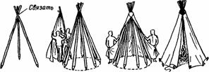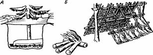 Более удобен для жилья двускатный шалаш (рис. 10,А и рис. 11,Б). Вбив стойки и уложив на них несущий брус, жерди на него укладывают под углом 45—60° с обеих сторон, и к каждому скату привязывают по три-четыре жерди параллельно земле — стропила. Затем, начиная снизу, на стропила укладывают лапник, ветви с густой листвой или куски коры так, чтобы каждый последующий слой, словно черепица, прикрывал нижний примерно до половины. Переднюю часть, входную, можно завесить куском ткани, а заднюю прикрывают одной-двумя жердями и заплетают лапником.