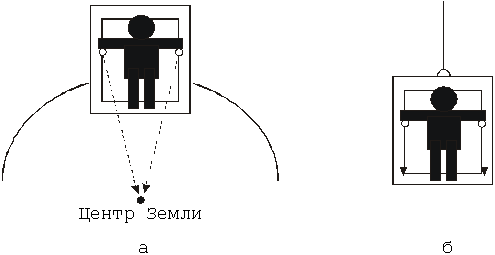 Эйнштейн предлагает провести мысленный эксперимент с лифтом, подвешенным над Землей. Наблюдатели, находящиеся внутри него, не смогут определить в некоторых ситуациях, находятся они в покое или в движении. Представим себе, что в какой-то момент времени канат, на котором подвешен лифт, обрывается, и наблюдатели в нем оказываются в состоянии свободного падения. В этом случае они не смогут определить, какое из двух противоположных утверждений будет истинным: 1) лифт движется в поле тяготения Земли; 2) лифт покоится в отсутствии поля тяготения. Если же в отсутствие поля тяготения Земли лифт будут тянуть вверх с ускорением §, то наблюдатели также не смогут выбрать истинное утверждение из двух противоположных: 1) лифт покоится в поле тяготения Земли; 2) лифт движется с ускорением в отсутствие поля тяготения.