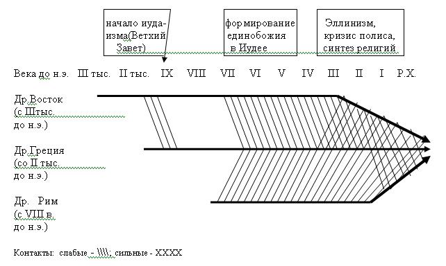 На пути к христианству античный мир прошел длительный и насыщенный путь развития, в котором линии развития Востока, Греции и Рима некоторое время проходили параллельно, но потом начали неуклонное сближение, усиливавшееся по мере установления контактов между различными цивилизациями и достигнув апогея в эпоху эллинизма (Греция + Восток) и в эпоху Римской империи. Схематически этот путь трех цивилизаций можно представить следующим образом: