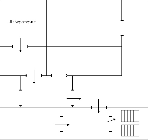 В случае возникновения пожара необходимо отключить электропитание, вызвать по телефону пожарную команду, эвакуировать людей из помещения согласно плану эвакуации, приведенному на рисунке_4.1 и приступить к ликвидации пожара огнетушителями. При наличии небольшого очага пламени можно воспользоваться подручными средствами с целью прекращения доступа воздуха к объекту возгорания.