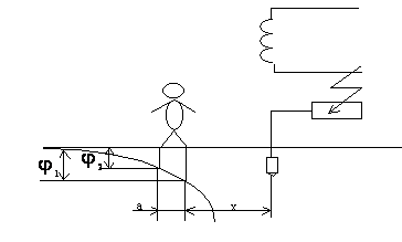 Напряжение шага — это разность потенциалов j1 и j2 в поле растекания тока по поверхности земли между точками, расположенными на расстоянии шага (» 0,8 м).