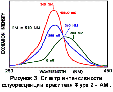 На рисунке 3 представлен спектр зонда Фура -2 AM. При связывании с кальцием происходит характерное изменение спектра возбуждения этого красителя: при возбуждении светом с длиной волны 390 нм происходит уменьшение флуоресценции, а при возбуждении светом, с длиной волны 340 нм - увеличение. Однако, 340 нм является уже ультрафиолетовым светом, и для ее использования необходим микроскоп с кварцевыми линзами. Поскольку в нашем случае был использован обычный микроскоп, то вторая волна была выбрана длиной 390 нм. 360 нм - это изобестическая точка зонда Фура -2, т.е. флуоресцентный сигнал при возбуждении светом этой длины волны не зависит от концентрации Ca2+ и есть функция лишь концентрации зонда.