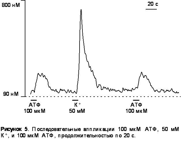 Амплитуда АТФ - индуцированного кальциевого транзиента варьировалась в пределах от 50 до 450 нМ. Среднее значение выброса [Ca2+]i вызванного приложением АТФ в концентрации 100 мкМ находилось в пределах 200-250 нМ.