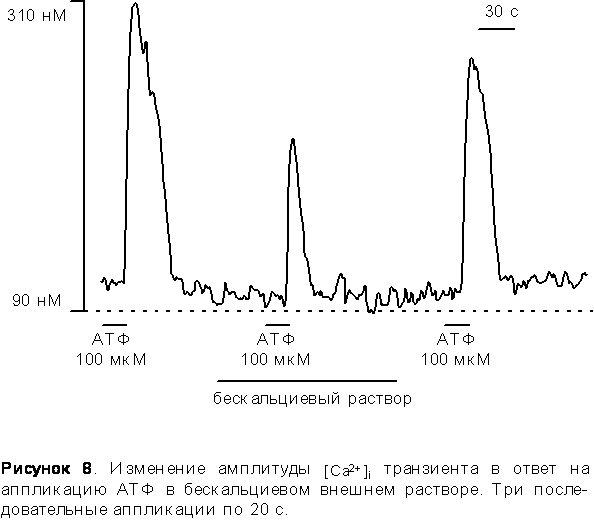В бескальциевом растворе - наоборот, вторая аппликация АТФ вызывала значительное уменьшение Ca2+ транзиента на 40% ± 5% от контроля. Последующие аппликации АТФ в бескальциевом растворе приводили к последовательному уменьшению амплитуды [Ca2+]i транзиента и после двух - трех последовательных аппликаций сигнал исчезал вообще (рисунок 10). Такое уменьшение вероятно обусловлено истощением внутриклеточных депо.