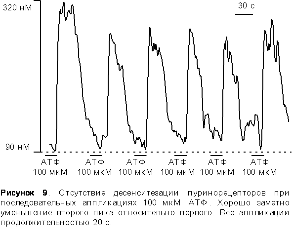 При исследовании средних слоев неокортекса крыс мы обнаружили их способность отвечать на приложение АТФ. Таким образом мы можем сделать вывод о наличии в данном объекте пуринорецепторов. Ответ на АТФ является доза - зависимым с амплитудой половинного ответа в 220 нМ. Последовательные приложения АТФ, после второго приложения, не вызывали уменьшения амплитуды [Ca2+]in транзиентов. Из этого можно сделать вывод об отсутствии десенситизации данного типа рецепторов.