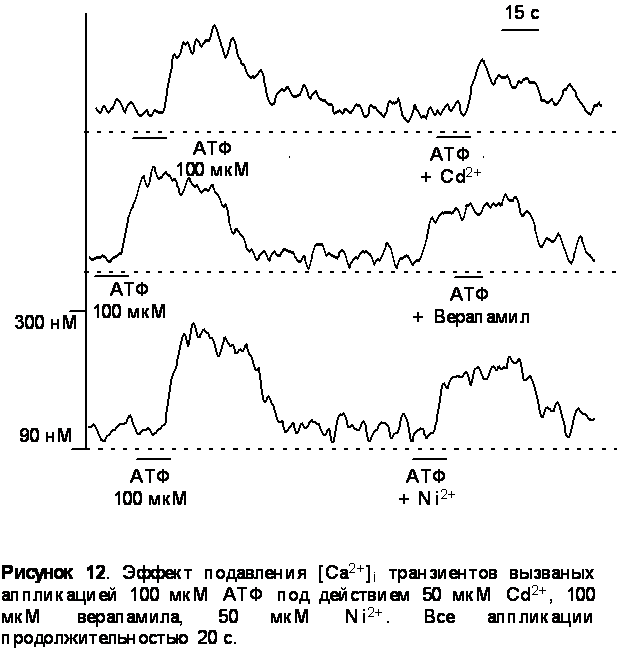 Исследуя источники повышения цитозольного кальция мы обнаружили, что АТФ активирует как ионотропные так и метаботропные рецепторы. Блокаторы потенциал - управляемых кальциевых каналов такие как кадмий, никель и верапамил уменьшали АТФ - индуцированные кальциевые транзиенты на 35% - 15%, что говорит об опосредованном АТФ активировании потенциал - управляемых каналов.