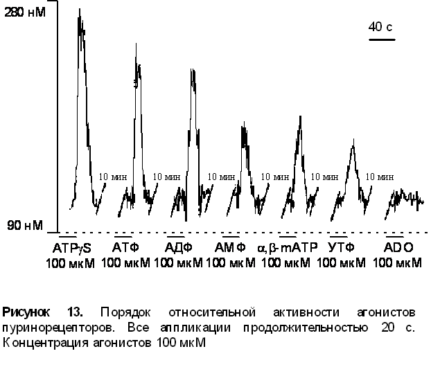 С целью обеспечения достоверности полученных данных, принимая во внимание тот факт, что работа проводилась на тонких срезах мозга, мы провели серию экспериментов с подавлением распостранения потенциалов действия с помощью тетродотоксина (TTX). При использовании TTX выяснилось, что амплитуда и форма [Ca2+]i транзиентов не изменяется или изменяется незначительно. Полученные результаты позволяют нам предполагать, что получаемые нами данные отображают процессы происходящие в отдельной наблюдаемой клетке. К сожалению мы не имели возможности проводить все эксперименты c тетродотоксином из-за дороговизны препарата. Для изучения характеристик рассматриваемых пуринорецепторов, принимающих участие в генерации [Ca2+]i транзиента, применялись следующие протоколы экспериментов.