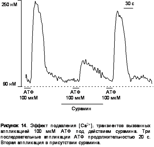 1. Сурамин, известный антагонист Р2 типа пуринорецепторов, уменьшал [Ca2+]i транзиенты, вызванные приложением 100 мкМ АТФ на 76% ± 7% и также не изменял концентрацию [Ca2+]i в покое. Данные представлены на рисунке 14.