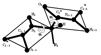 Пептидная связь вследствие p, p-сопряжения p-связи карбонильной группы и р-орбитали атома N, на котором находится не поделенная пара электронов, не может рассматриваться как одинарная и вращение вокруг нее практически отсутствует. По этой же причине хиральный атом C a и карбонильный атом C k любого i-го аминокислотного остатка пептидной цепи и атомы N и Сa(i+1)-го остатка находятся в одной плоскости. В этой же плоскости находятся карбонильный атом О и амидный атом Н ( однако накопленный при изучении структуры белков материал показывает, что это утверждение не совсем строго: атомы, связанные с пептидным атомом азота, находятся не в одной плоскости с ним, а образуют трехгранную пирамиду с углами между связями, очень близкими к 120°. Поэтому между плоскостями, образованными атомами Cia, Cik, Oi и Ni+1, Hi+1, Ci+1a , существует некоторый угол, отличающийся от 0°. Но, как правило, он не превышает 1° и не играет особой роли). Поэтому геометрически полипептидную цепочку можно рассматривать как образованную такими плоскими фрагментами, содержащими каждый по шесть атомов. Взаимное расположение этих фрагментов, как и всякое взаимное расположение двух плоскостей, должно определятся двумя углами. В качестве таковых принято брать торсионные углы, характеризующие вращения вокруг s-связей N ¾ C a и C a ¾ C k.