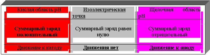 Эти же группировки имеют и электрические заряды, формирующие общий заряд белковой молекулы. В белках, где преобладают аспарагиновая и глутаминовая аминокислоты, заряд белка будет отрицательным, избыток основных аминокислот придает положительный заряд белковой молекуле. Вследствие этого в электрическом поле белки будут передвигаться к катоду или аноду в зависимости от величины их общего заряда. Так, в щелочной среде (рН 7 – 14) белок отдает протон и заряжается отрицательно, тогда как в кислой среде (рН 1 – 7) подавляется диссоциация кислотных групп и белок становится катионом.