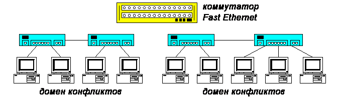 В сети Fast Ethernet организуются несколько доменов конфликтов, но с обязательным учетом класса повторителя, используемого в доменах.