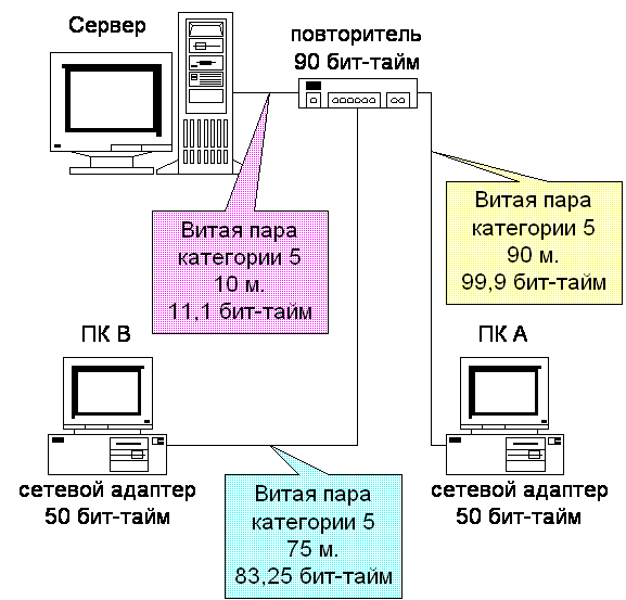 Различные типы кабелей и устройств Fast Ethernet дают разную величину задержки RTD. Витая пара категории 5 – 1,11 бит-тайм на метр длины, оптоволоконный кабель 1 бит-тайм также на метр длины, сетевой адаптер – 50 бит-тайм, медиаконвертеры от 50 до 100, повторитель класса I –140, повторитель класса II – 92 бит-тайм. Задержку RTD между двумя сетевыми узлами рассчитать несложно, она равняется сумме соответствующих задержек их сетевых адаптеров и всех промежуточных сетевых компонентов (кабелей, повторителей).