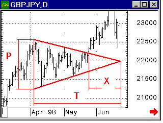 Цена пробивает как минимум на ценовую базу Р. В треугольнике не менее пяти волн. Их число нечетное.