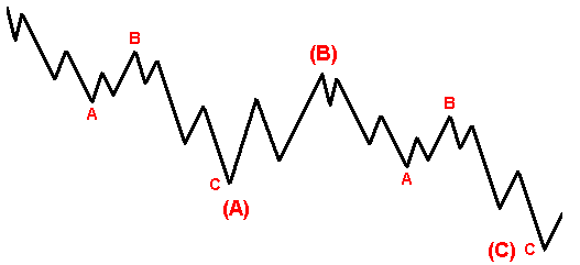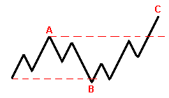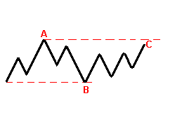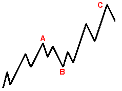 Вершина волны (В) превышает верх волны (А), а волна (С) опускается ниже основания волны (А) для бычьего рынка, и, наоборот, для медвежьего.