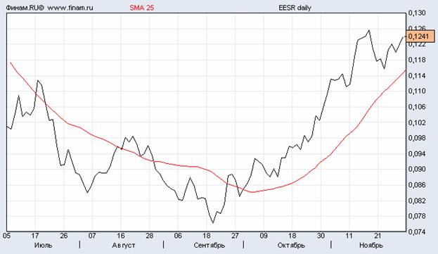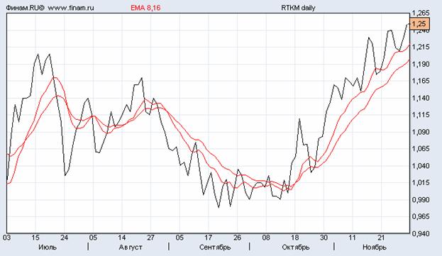 Тогда на свет появились экспоненциальные скользящие средние (EMA). Их отличие как раз и заключается в том, что больший вес при расчете среднего значения за период придается недавним данным, а вес старых данных уменьшен. Чем короче интервал наблюдения, а следовательно, больше экспонента, чувствительность ЕМА возрастает, и если это становится негативным фактором, то единственно верным решением будет расширение периода наблюдений, другими словами, использование приема сглаживания кривой ЕМА переходом на другую экспоненту. Это можно делать и во второй и третий раз, помня лишь о том, что не соответствующее анализируемому рыночному циклу расширение интервала ЕМА ведет к потере ее чувствительности.