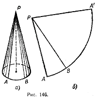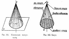 Конус Рассмотрим окружность L с центром О и прямую ОР, перпендикулярную к плоскости этой окружности. Каждую точку окружности соединим отрезком с точкой Р. Поверхность, образованная этими отрезками, называется конической поверхностью (рис. 141), а сами отрезки — образующими конической поверхности.