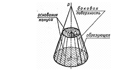 Отрезки, соединяющие вершину конуса с точьками окружности основания, называются образующими конуса. Поверхность конуса состоит из основания и боковой поверхности.