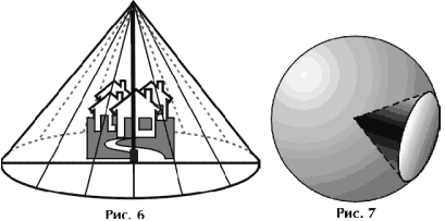 5. В физике встречается понятие «телесный угол». Это конусообразный угол, вырезанный в шаре. Единица измерения телесного угла – 1 стерадиан. 1 стерадиан – это телесный угол, квадрат радиуса которого равен площади части сферы, которую он вырезает (рис. 7). Если в этот угол поместить источник света в 1 канделу (1 свечу), то получим световой поток в 1 люмен. Свет от киноаппарата, прожектора распространяется в виде конуса.