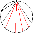 Есть по крайней мере три способа «выбрать наудачу хорду в круге». 1. Зафиксируем одну точку (конец хорды) на окружности и выберем наудачу на окружности другую точку (второй конец хорды). Здесь Ω = [0, 2π], а благоприятными являются положения второй точки на интервале [2π/3, 4π/3] (хорды, помеченные на рисунке красным цветом). Вероятность получить «длинную» хорду равна 1/3.