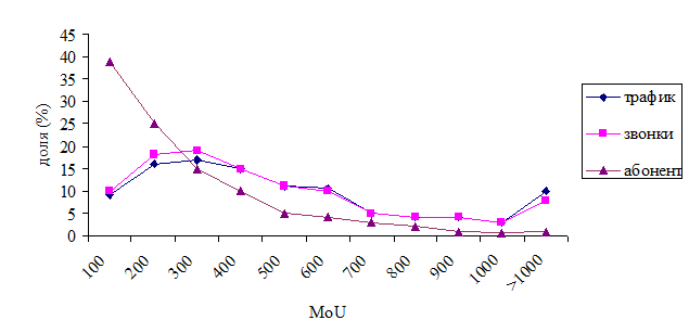 Рисунок 1 - Распределение численности абонентов, количества звонков и вклада в общий трафик в зависимости от MОU