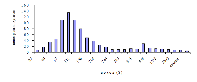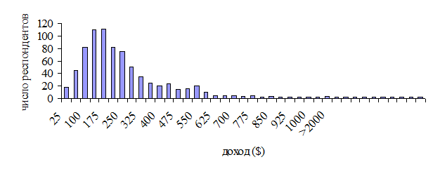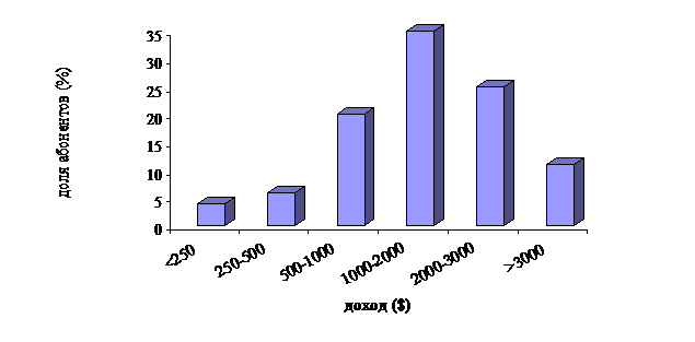 В России распределение доходов носит более сложный характер, чем в США. На рис.5 показана характерная для докризисной России структура доходов населения. Наличие двух пиков демонстрирует то, что в нашей стране совокупность неоднородна (существует расслоение общества и непропорциональное распределение доходов). Верхний пик распределения (в целом по России он составляет около 3-х миллионов человек) до сегодняшнего дня является основным источником абонентов сотовых сетей.