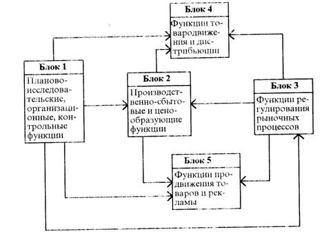 Блок 1. Планово-исследовательские, контрольные и организационные функции: 1.1 - маркетинговое исследование (сбор и анализ информации) прогнозирование рынка); 1.2 - разработка маркетинговой стратегии; 1.3 - составление плана и бюджета маркетинга, разработка оперативной программы маркетинговых мероприятий; 1.4 - маркетинговый контроллинг; 1.5 - организация маркетинга.