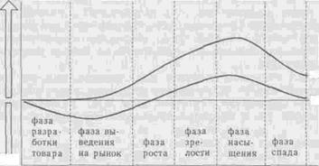 Маркетинг в первую очередь интересует цикл жизни товара на рынке. Жизненный цикл товара — это время существования товара на рынке. Концепция ЖЦТ исходит из того, что любой товар рано или поздно вытесняется с рынка другим, более совершенным или дешевым товаром. Фазы ЖЦТ делят обычно на внедрение (введение), рост, зрелость, насыщение и спад (рис.12.1).
