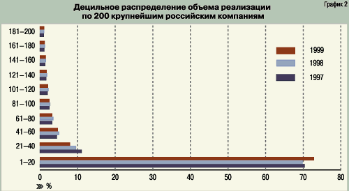 На долю первого дециля (10% крупнейших компаний) российского рейтинга пришлось 72,9% суммарного объема реализации группы "Эксперт-200", в то время как на долю десятого дециля (10% последних компаний из списка) - 1,2%. Таким образом, децильный коэффициент дифференциации превысил 60, в то время как год назад он был равен 58.