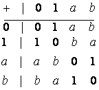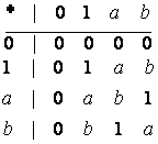 2. Поле, содержащее конечное число элементов, очевидно имеет положительную характеристику. Рассмотрим следующий пример. Пусть множество X содержит 4 элемента: 0, 1, a, b, которые складываются и перемножаются в соответствие со следующими таблицами:
